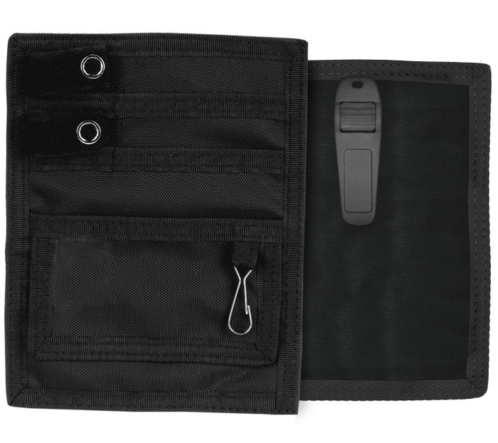 - 4 front pockets, a Velcro-closure coin pocket, key chain clip
