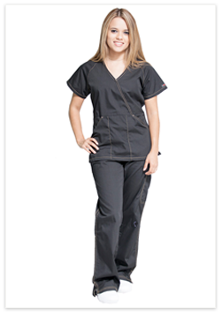 - The scrub pant features a flat front, elastic back, cargo pocket, two side pockets, bottom slits and quad stitching along the outer seam.