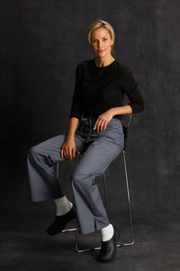 V-neck faux wrap tunic with set-in sleeves. Two large, top-loading patch pockets. Two contouring back darts.